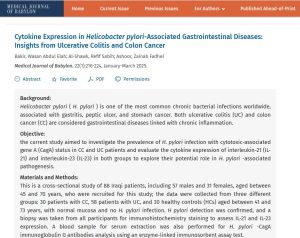 ويهدف البحث الى التحقق من مدى انتشار عدوى الملوية البوابية (H. pylori) مع حالة جين A المرتبط بالسمية الخلوية (CagA) لدى مرضى سرطان القولون (CC) والتهاب القولون التقرحي (UC)، وتقييم التعبير السيتوكيني للإنترلوكين-21 (IL-21) والإنترلوكين-23 (IL-23) في كلتا المجموعتين لاستكشاف دورهم المحتمل في الإمراض المرتبط بالملوية البوابية.
