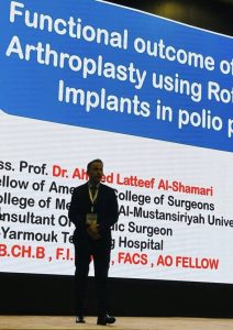 وكانت مشاركة الدكتور احمد لطيف القاءه محاضرة علمية حول ( زراعة مفصل الركبة لمرضى شلل الأطفال Functional outcome of Total Knee Arthroplasty using Rotating Hinge Implants in polio patients ) .