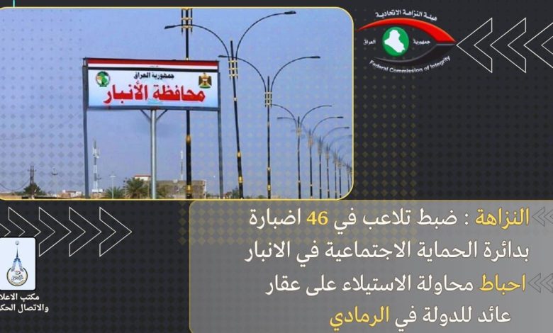تمكَّنت ملاكات هيئةِ النزاهة الإتحاديَّة من كشف عمليَّات تلاعبٍ في (٤٦) إضبارةً خاصَّةً بدائرة الحماية الاجتماعيَّة في مُحافظةِ الأنبار؛ فيما أحبطت محاولة للاستيلاء على عقارٍ عائدٍ للدولة في المدينة.