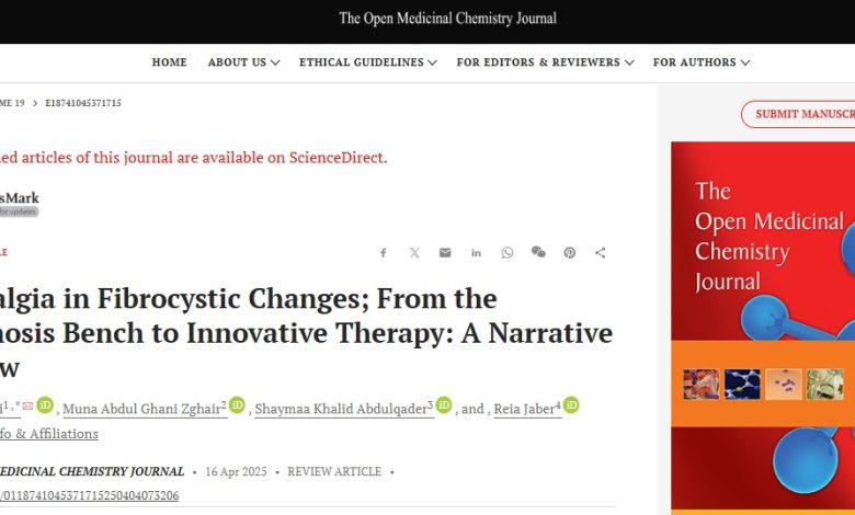 ضمن النشاطات العلمية والبحثية المشتركة بين أساتذة كلية الطب / الجامعة المستنصرية نشرت مجلة الكيمياء الطبية المفتوحة The Open Medicinal Chemistry Journal بحثاً علمياً مشتركاً حول ( ألم الثدي في التغيرات الليفية الكيسية؛ من التشخيص إلى العلاجات المبتكرة Mastalgia in Fibrocystic Changes; From the Diagnosis Bench to Innovative Therapy: A Narrative Review ) في العدد 16 Apr 2025 والذي أعدته كل من الأستاذ الدكتورة منى عبد الغني الراوي ( التدريسية في فرع الجراحة – اختصاص أشعة تشخيصية ) والأستاذ المساعد الدكتورة وسن نوري محمد ( التدريسية في فرع النسائية والتوليد ) بالتعاون مع باحثة من جامعة بغداد وباحثة من الولايات المتحدة الامريكية.