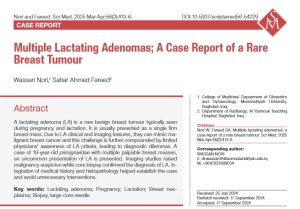 نشرت مجلة سجلات طبية Scripta Medica بحثاً علمياً مشتركاً حول ( أدينوما الإرضاع المتعددة: تقرير حالة لورم نادر في الثدي A Multiple Lactating Adenomas; A Case Report of a Rare Breast Tumour ) في المجلد 56 العدد 2 (2025) والذي أعدته الأستاذ المساعد الدكتورة وسن نوري محمد ( التدريسية في فرع النسائية والتوليد في كلية الطب / الجامعة المستنصرية ) بالتعاون مع باحثة من وزارة الصحة .
