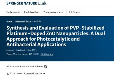 نشرت مجلة BioNanoScience بحثاً علمياً مشتركاً حول ( تخليق وتقييم جسيمات نانوية من أكسيد الزنك المستقرة بالبلاتين والمشبعة بالبولي فينيل بيروليدون: نهج مزدوج للتطبيقات الضوئية والمضادة للبكتيريا Synthesis and Evaluation of PVP-Stabilized Platinum-Doped ZnO Nanoparticles: A Dual Approach for Photocatalytic and Antibacterial Applications ) في المجلد 15، 19 آيار 2025 والذي أعده المدرس المساعد علي مجيد أحمد ( التدريسي في فرع علم وظائف الأعضاء ( الفسلجة ) في كلية الطب / الجامعة المستنصرية ) بالتعاون مع باحث من جامعة الكرخ للعلوم.