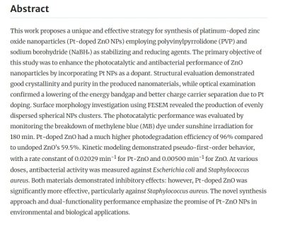 ويتناول البحث ابتكار طريقة فعالة لتخليق جسيمات نانوية من أكسيد الزنك (ZnO) مشوبة بجسيمات البلاتين (Pt) باستخدام مادة PVP كمثبت و NaBH₄ كمختزل، بهدف تعزيز الخصائص الضوئية والمضادة للبكتيريا لهذه المواد.