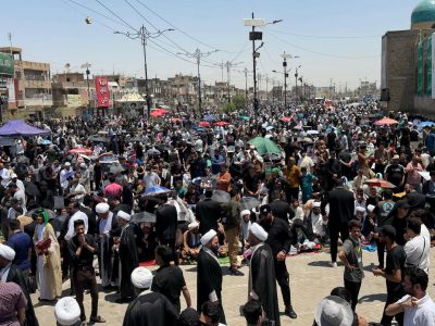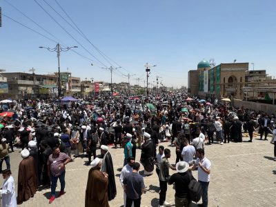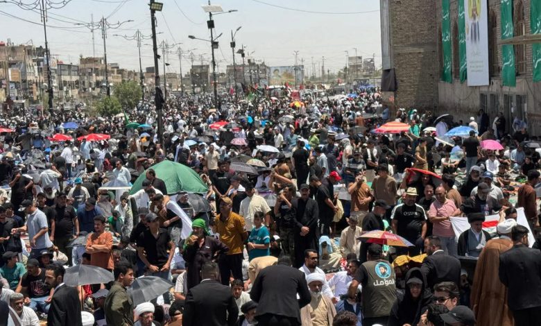 بالصور.. أنصار السيد مقتدى الصدر يتوافدون إلى مدينة الصدر لإقامة صلاة الجمعة والتظاهر ضد العـدوان الاسرائيلي على ايران وانتهــاك الأجواء العراقية