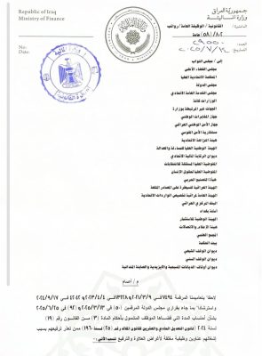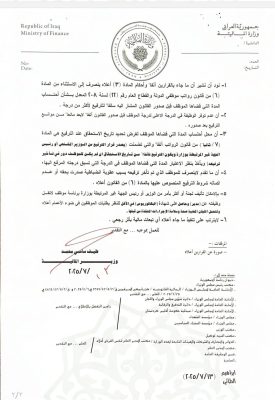 وزارة المالية تقرر اعتماد تاريخ المدة التي قضاها الموظف بالتسكين لغرض تحديد تاريخ الاستحقاق.