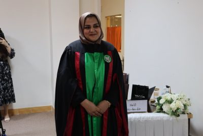 وكانت لجنة المناقشة برئاسة أ.م.د. شذى محمد جواد الخطيب وعضوية كل من أ.م.د. نبيهة نجاتي أكرم وأ.م.د. رنا علي حمدي وإشراف كل من أ.م.د. ولاء احمد عبد الرحمن وأ.م.د. صباح محسن علي ، وبحضور عميد الكلية الأستاذ المساعد الدكتور غسان علي القزويني ومعاون العميد للشؤون العلمية والطلبة الأستاذ المساعد الدكتور نبراس حاتم خميس ونخبة من الأساتذة والأطباء وطلبة الدراسات العليا.