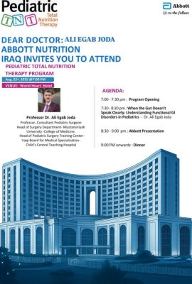 ألقى الأستاذ الدكتور علي عكاب جودة ( رئيس فرع الجراحة – استشاري جراحة طب الأطفال في كلية الطب / الجامعة المستنصرية ) وضمن نشاطات الكلية في الخدمات المجتمعية محاضرة علمية بعنوان ( عندما لا تتكلم الأمعاء بوضوح : فهم الاضطرابات الوظيفية في الجهاز الهضمي لدى الأطفال ) وبحضور نخبة من الأطباء الاستشاريين والأخصائيين في مجال طب وجراحة الأطفال وعلى قاعة فندق قلب العالم في بغداد