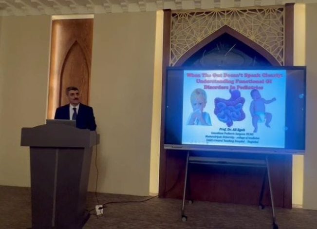 رئيس فرع الجراحة في كلية طب المستنصرية يلقي محاضرة علمية عن فهم الاضطرابات الوظيفية في الجهاز الهضمي لدى الأطفال