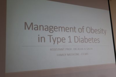 وبينت المحاضرة ان مرضى السكري النوع الأول يعاني بزيادة مفرطة في الوزن بعد سنوات من استعمال علاج الانسولين وذلك بسبب عدم انتظام الغذاء لديهم والخوف من هبوط السكر ، مما أدى إلى زيادة الوزن وزيادة مقاومة الأنسولين لديهم.