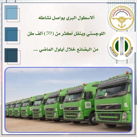 ألاسطول البري يواصل نشاطه اللوجستي وينقل أكثر من (59) ألف طن من البضائع خلال أيلول الماضي .