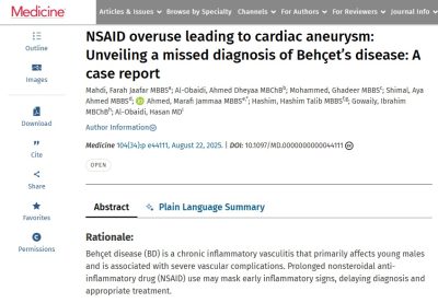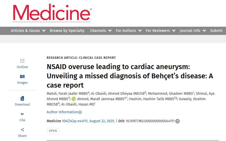 نشرت مجلة الطب Medicine حالة مرضية نادرة عن ( الإفراط في استخدام مضادات الالتهاب غير الستيرويدية يؤدي إلى تمدد الأوعية الدموية في القلب: الكشف عن تشخيص خاطئ لمرض بهجت: تقرير حالة NSAID overuse leading to cardiac aneurysm: Unveiling a missed diagnosis of Behçet’s disease: A case report ) في 22 آب 2025 – المجلد 104 – العدد 34 والذي أعدته المدرس الدكتورة فرح جعفر مهدي ( التدريسية في فرع الطب الباطني في كلية الطب / الجامعة المستنصرية / اختصاص أمراض المفاصل والروماتزم والتأهيل الطبي ) بالتعاون مع باحثين من كلية الطب / جامعة بغداد وكلية الطب/ جامعة الكوفة وكلية الطب / جامعة وارث الأنبياء وكلية الطب / جامعة طنطا من مصر وكلية الطب / جامعة بحري من دولة السودان وجامعة أوريغون للصحة والعلوم من بورتلاند أوريغون والمركز الطبي لمستشفى جامايكا في نيويورك .