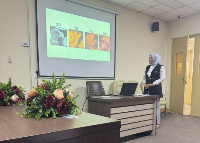 محاضرة علمية في كلية طب المستنصرية عن الجوانب التقنية والطبية في التصوير بالموجات فوق الصوتية وأهميتها في تشخيص التشوهات الجنينية المبكرة