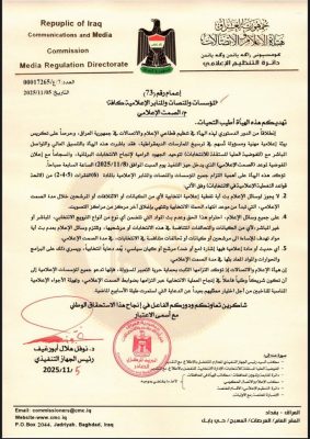 هيئة الإعلام والاتصالات لوسائل الاعلام العراقية: الصمت الاعلامي بخصوص الانتخابات يدخل حيز التنفيذ في تمام الساعة السابعة صباحاً من يوم السبت المقبل.