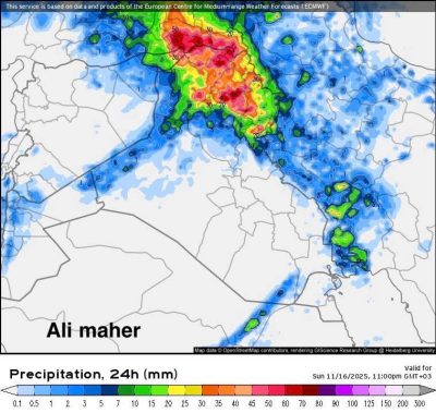 #ثانيا:درجات الحرارة والرياح:نتوقع حصول انخفاض كبير على درجات الحرارة في مدن الشمال لتنخفض العظمى الى مادون ال 15م وبالتالي سوف تتحول الاجواء الى شتوية قارسة بامتياز تستدعي ارتداء الملابس السميكة بينما يكون الانخفاض متوسط محسوس نوعا ما في باقي المدن لتنخفض العظمى في بغداد وماحولها الى 25 مئوية يوم غدا الاحد اما الرياح ستكون جنوبية شرقية الى متقلبة الاتجاه خفيفة السرعة الى معتدلة بينما تكون جنوبية شرقية نشطة في مدن الشمال والخارطة ادناه توضح تراكم الامطار من النموذج الاوروبي ليوم غدا الاحد والمفاجات الخريفية واردة بين السلب والايجاب.