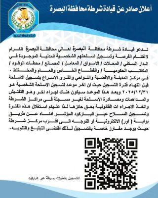 شرطة البصرة تدعو المواطنين لتسجيل السلاح قبيل انتهاء الفترة بنهاية العام الجاري