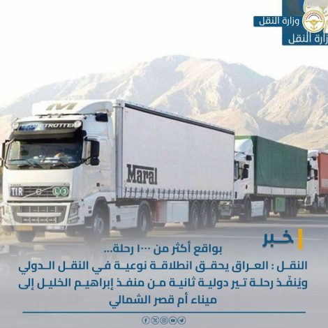 بواقع أكثر من 1000 رحلة… النقل : العراق يُحقق إنطلاقة نوعية في النقل الدولي ويُنفّذ رحلة تير دولية ثانية من منفذ إبراهيم الخليل إلى ميناء أم قصر الشمالي