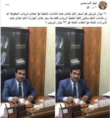 أوضح الخبير الاقتصادي نبيل المرسومي، اليوم الجمعة، أن العائدات النفطية في العراق تتعادل مع إجمالي الرواتب عند سعر 60 دولاراً للبرميل، مشيراً إلى أن هذا المستوى يكفي فقط لتغطية الرواتب الشهرية للموظفين، بينما يصل سعر تعادل الموازنة العامة، الذي تتوازن عنده الإيرادات العامة مع النفقات، إلى 92 دولاراً للبرميل.