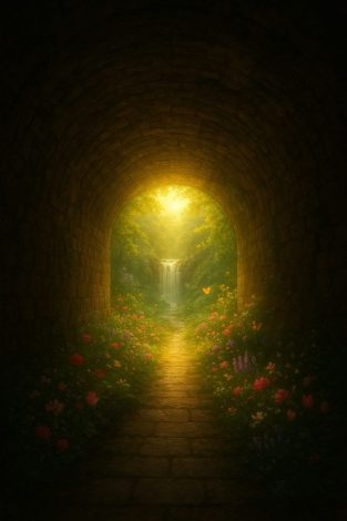 وكلما اقتربتُ من الضوء، بدأت تتضح لي أصواتُ المياه الجارية وزقزقةُ العصافير، بالإضافة إلى روائح الورد المتنوعة من الجوري والياسمين والتوليب واللافندر. ومع كل خطوة نحو نهاية المسار، يزداد الضوء والروائح وضوحًا.