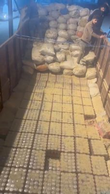 _ تم ضبط عجلة محمله بمادة التبن مخبأ خلفها (مشروبات كحولية) بعدد اجمالي 7200 علبه تم تنظيم محضر ضبط اصولي مشترك لاتخاذ الاجراءات القانونية.