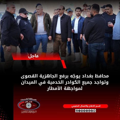 وجّه محافظ بغداد، المهندس عطوان العطواني، اليوم، بتواجد جميع كوادر المحافظة في الميدان وإعلان حالة الاستنفار القصوى لكافة القطاعات الخدمية، بالتزامن مع استمرار هطول الأمطار الغزيرة التي تشهدها العاصمة.