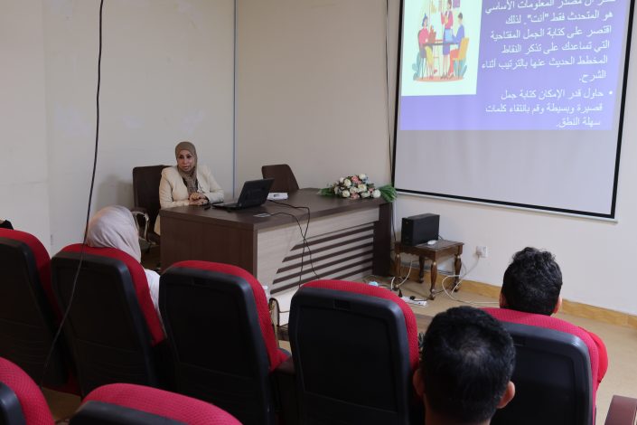 وتطرقت الورشة الى شرح العرض التقديمي الذي هو وسيلة مساعدة ومساندة للمتحدث وليس مصدراً للمعلومات.