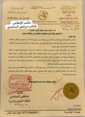 أعلن النائب مرتضى الساعدي، اليوم الجمعة ، حصوله على موافقة رئيس مجلس الوزراء لتخصيص قطعة أرض في محافظة ميسان، لإنشاء مجمع متكامل يضم مختلف النقابات والاتحادات المهنية.